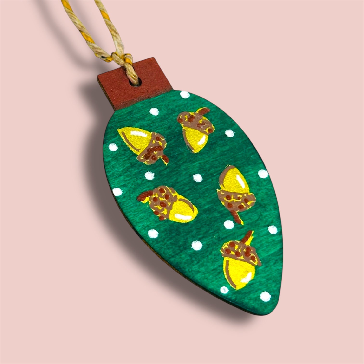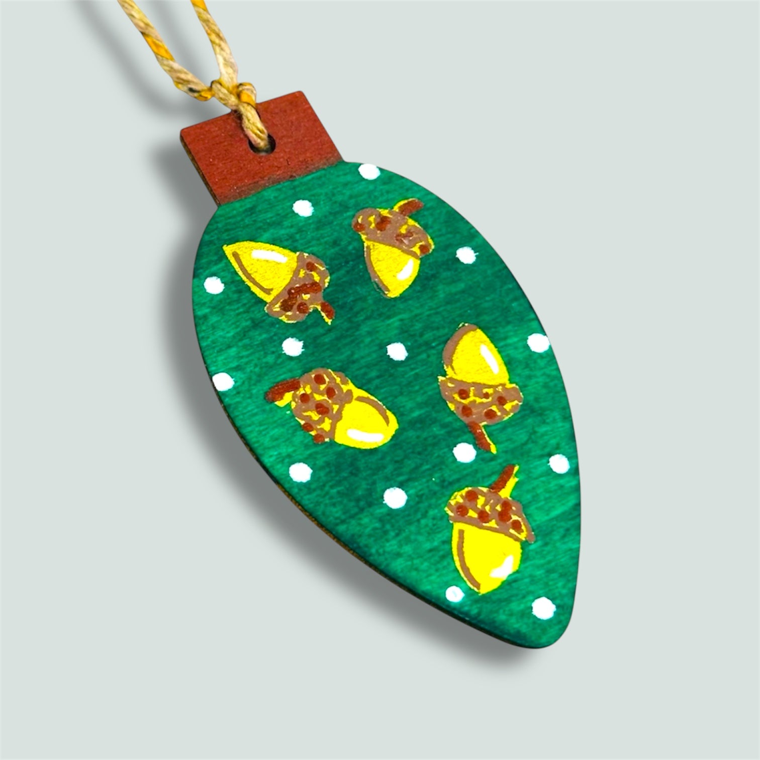 Hand painted with golden acorns on a rich green background, this charming decoration is perfect for adding a touch of nature to your home.