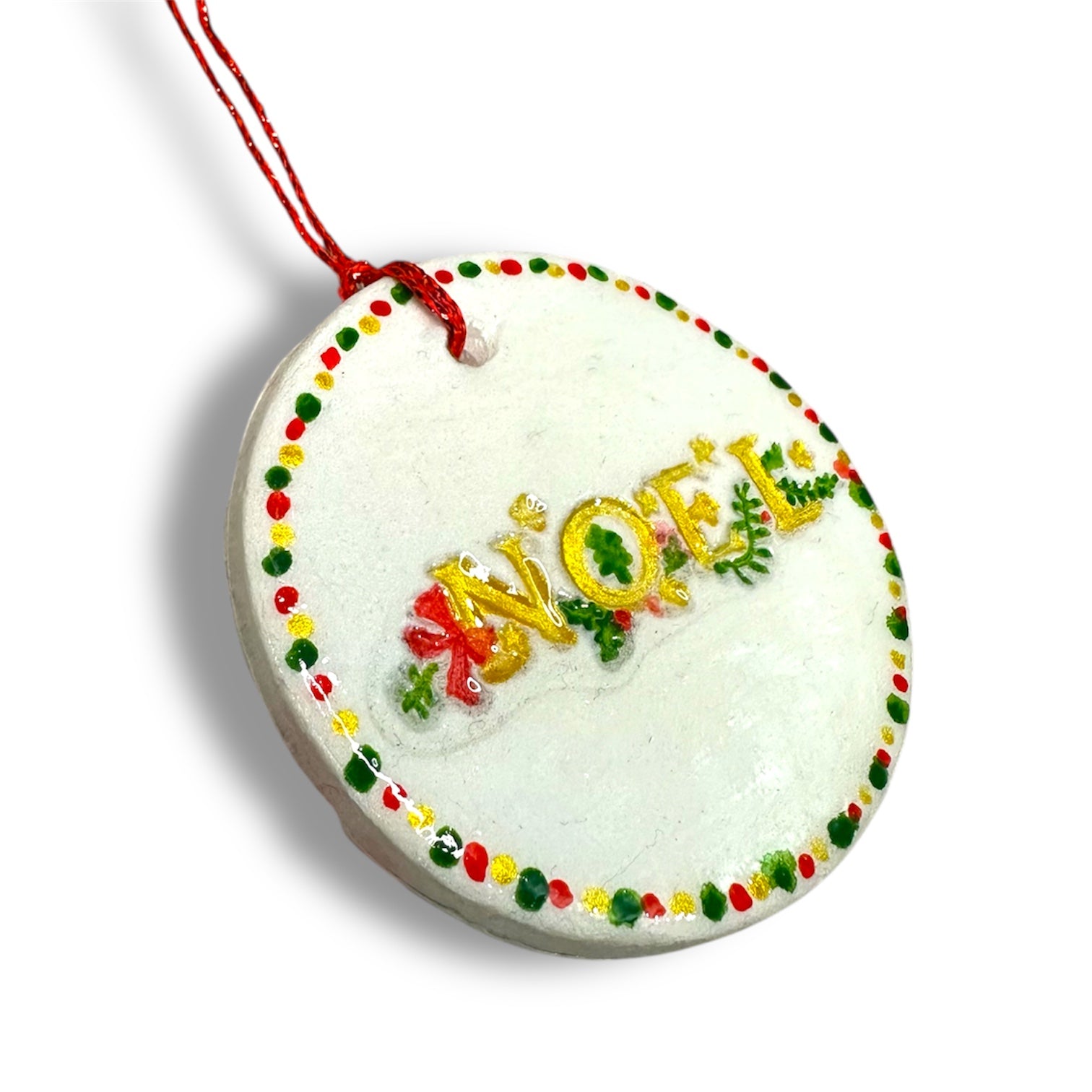 Each piece is carefully hand painted and stamped with "noel". With a varnish coating for waterproofing, this ornament is sure to last for years to come.
