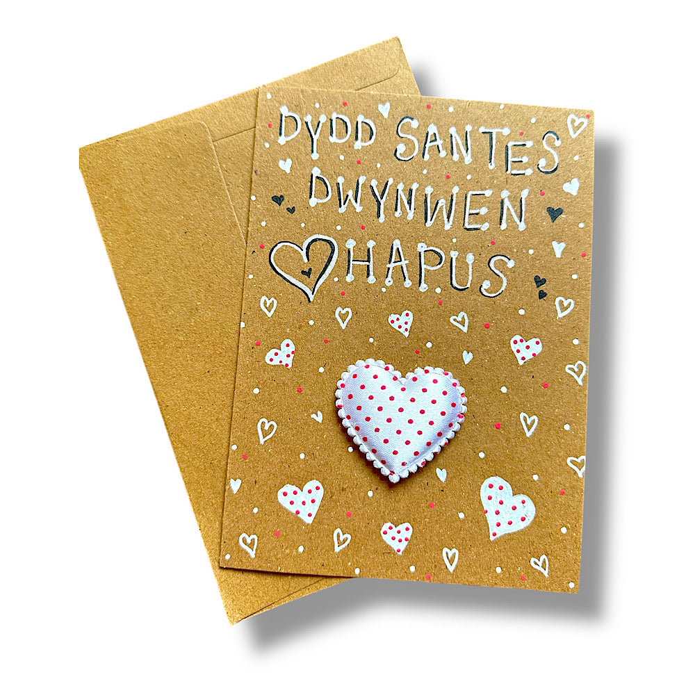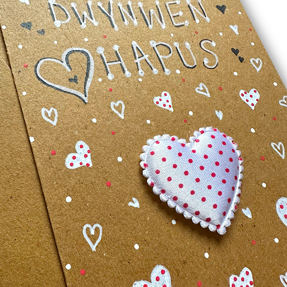 Happy Dydd Santes Dwynwen, the Welsh Valentine's Day card! Celebrate on the 25th with this special card featuring a fabric red and white polka dot heart and charming illustrations.