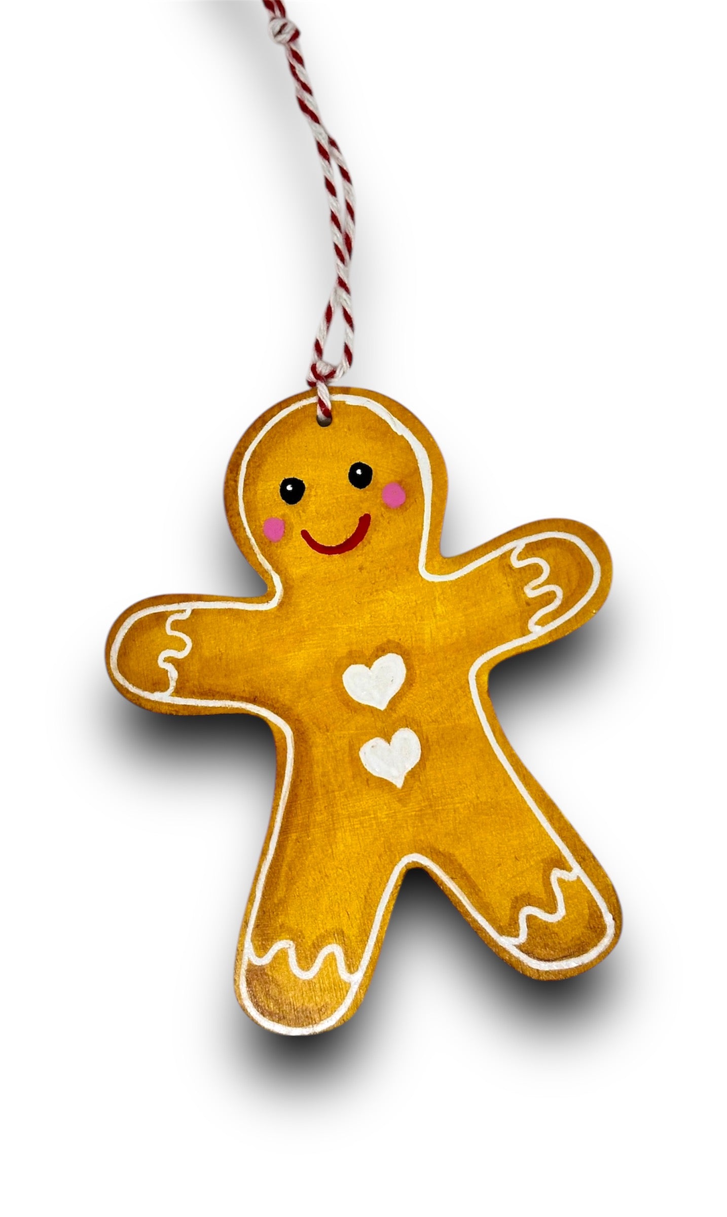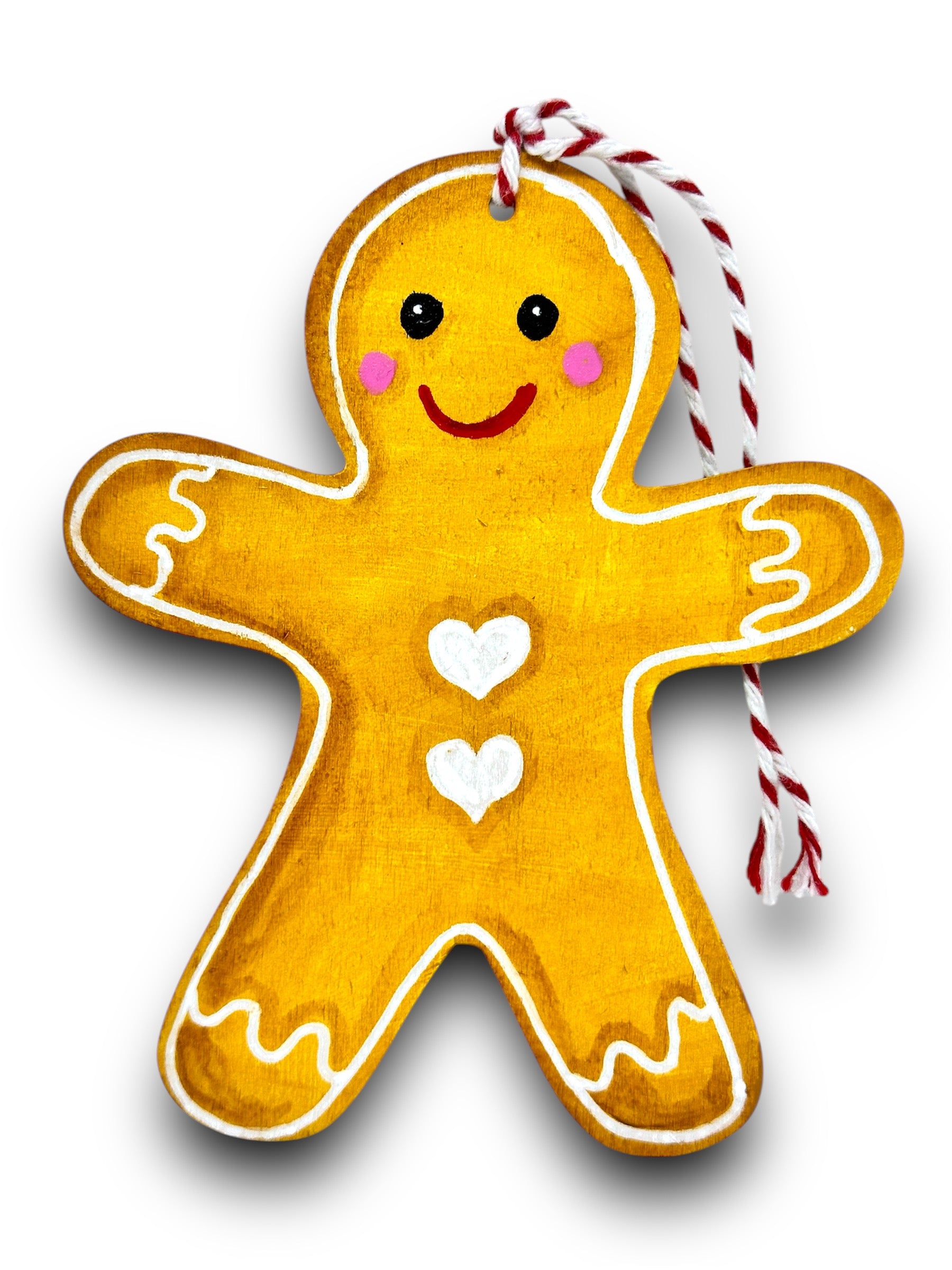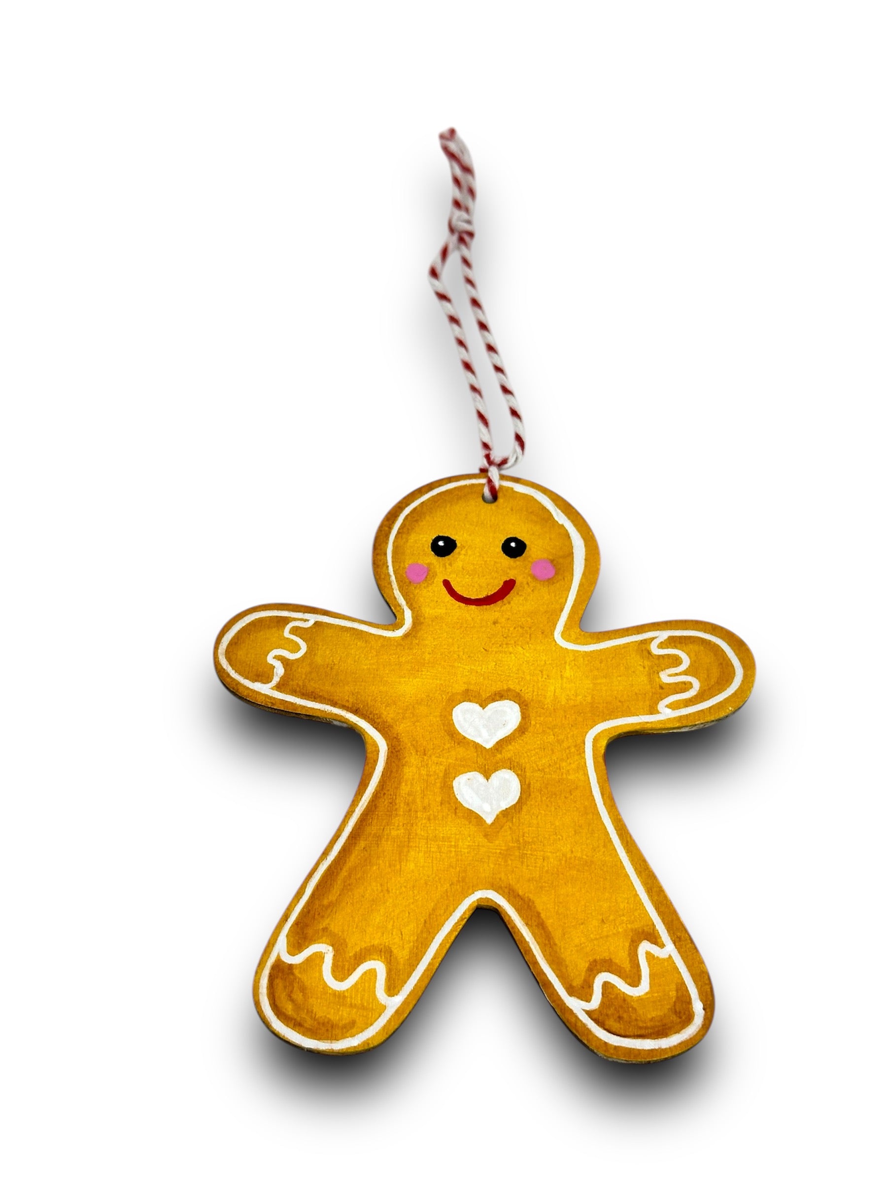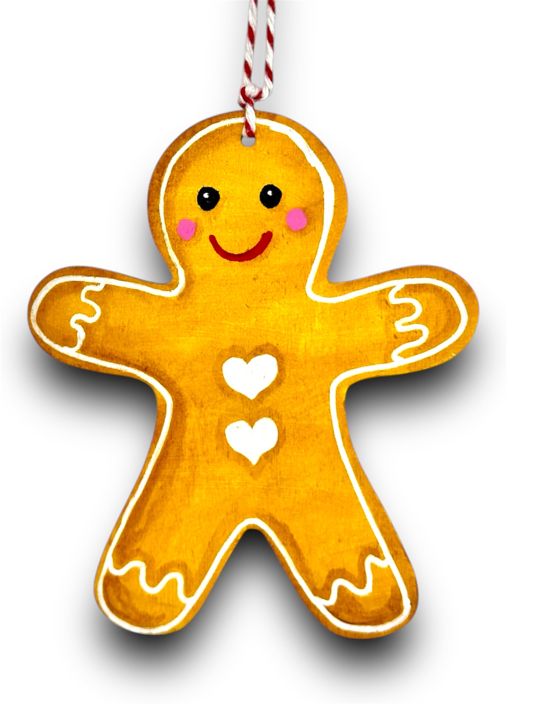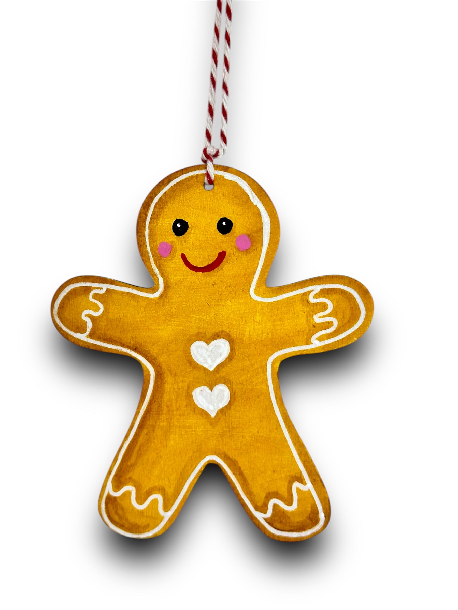 Make your holiday decoration extra sweet with this hand painted Christmas gingerbread man ornament! Featuring a cute design with heart shaped buttons, this acrylic on wood decoration is sure to add a playful touch to your festivities. Bring some fun and charm to your tree this season!
