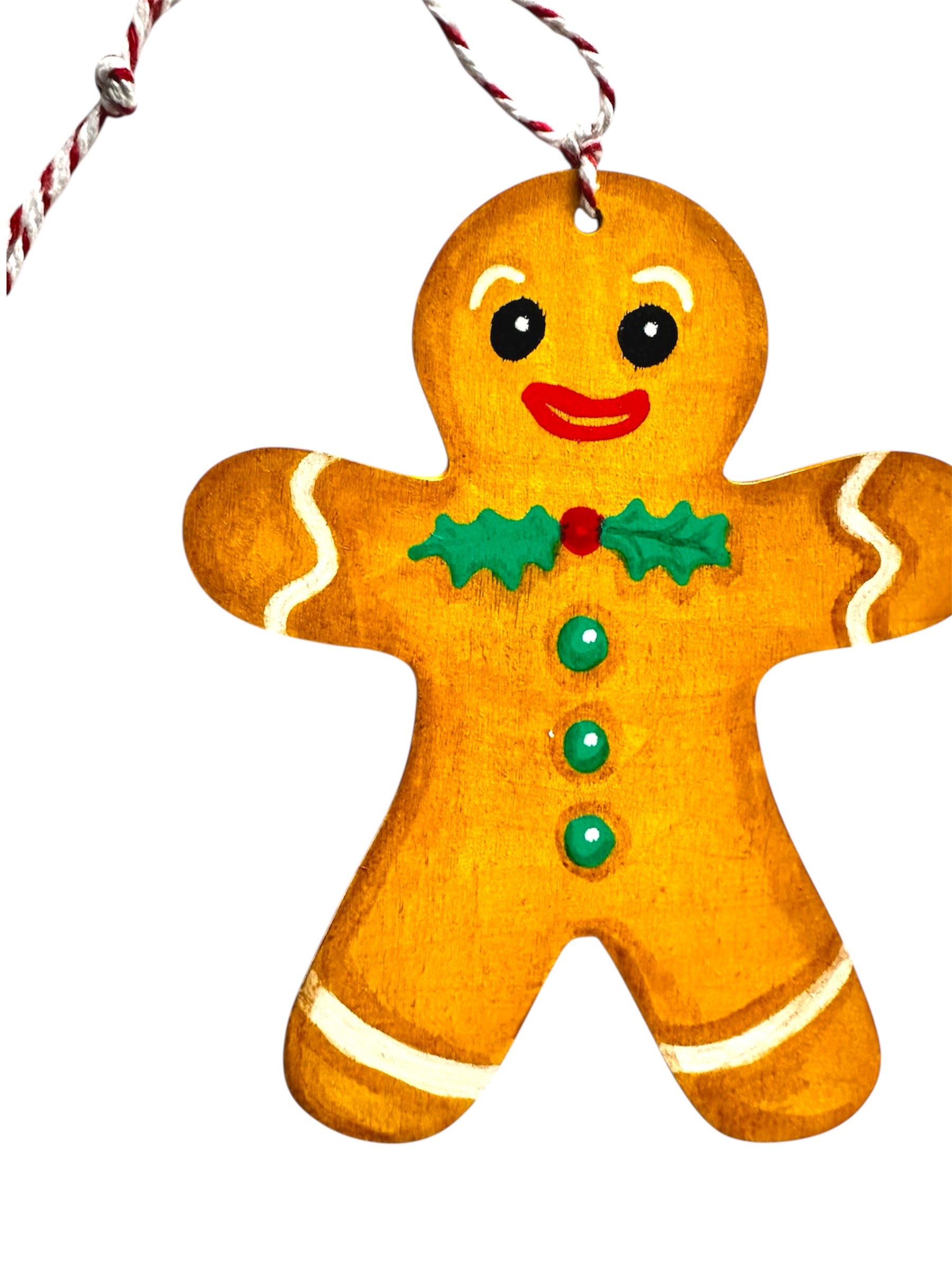 Add a sweet touch to your Christmas tree with this hand-painted gingerbread man ornament. Made of acrylic on wood, this decoration is both festive and durable. And with its included twine, it's ready to hang in no time. Perfect for the holiday season!