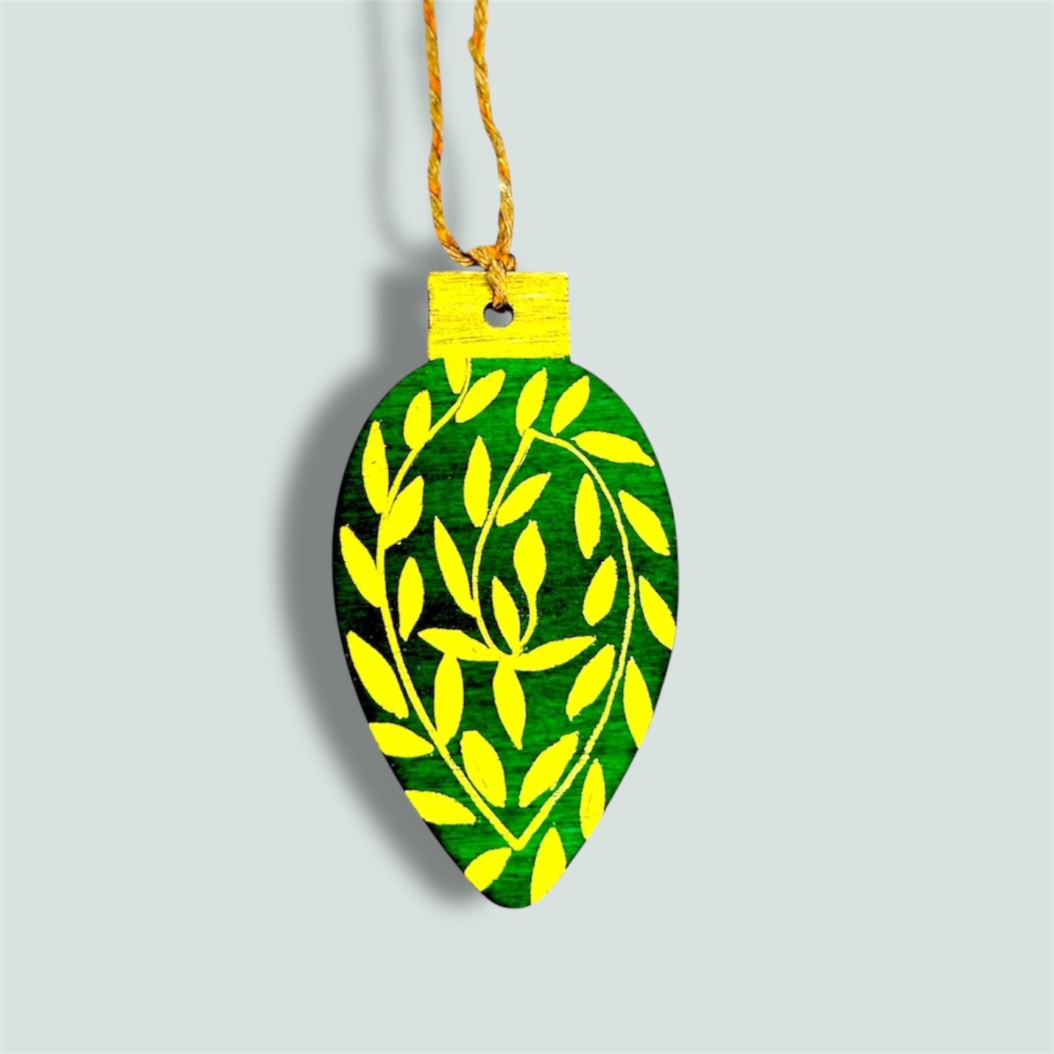A beautiful rich,vibrant green background and hand painted golden leaves on this one of a kind handmade Christmas decoration.