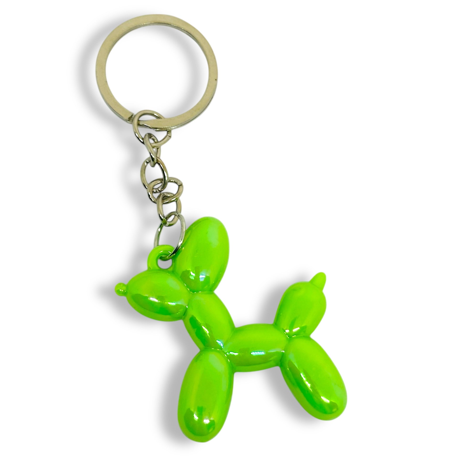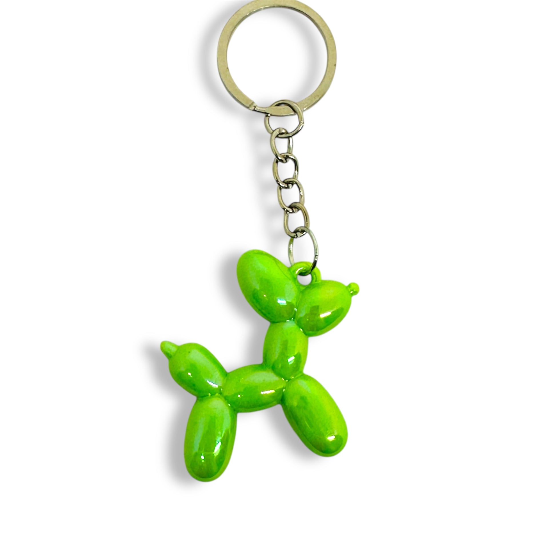 "Take this playful companion with you everywhere - a handcrafted, iridescent green balloon dog keyring on a silver keychain.