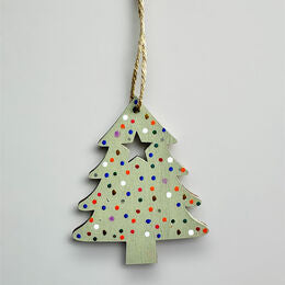 A hand painted wooden Christmas tree decoration. Sage green with multicoloured dots.