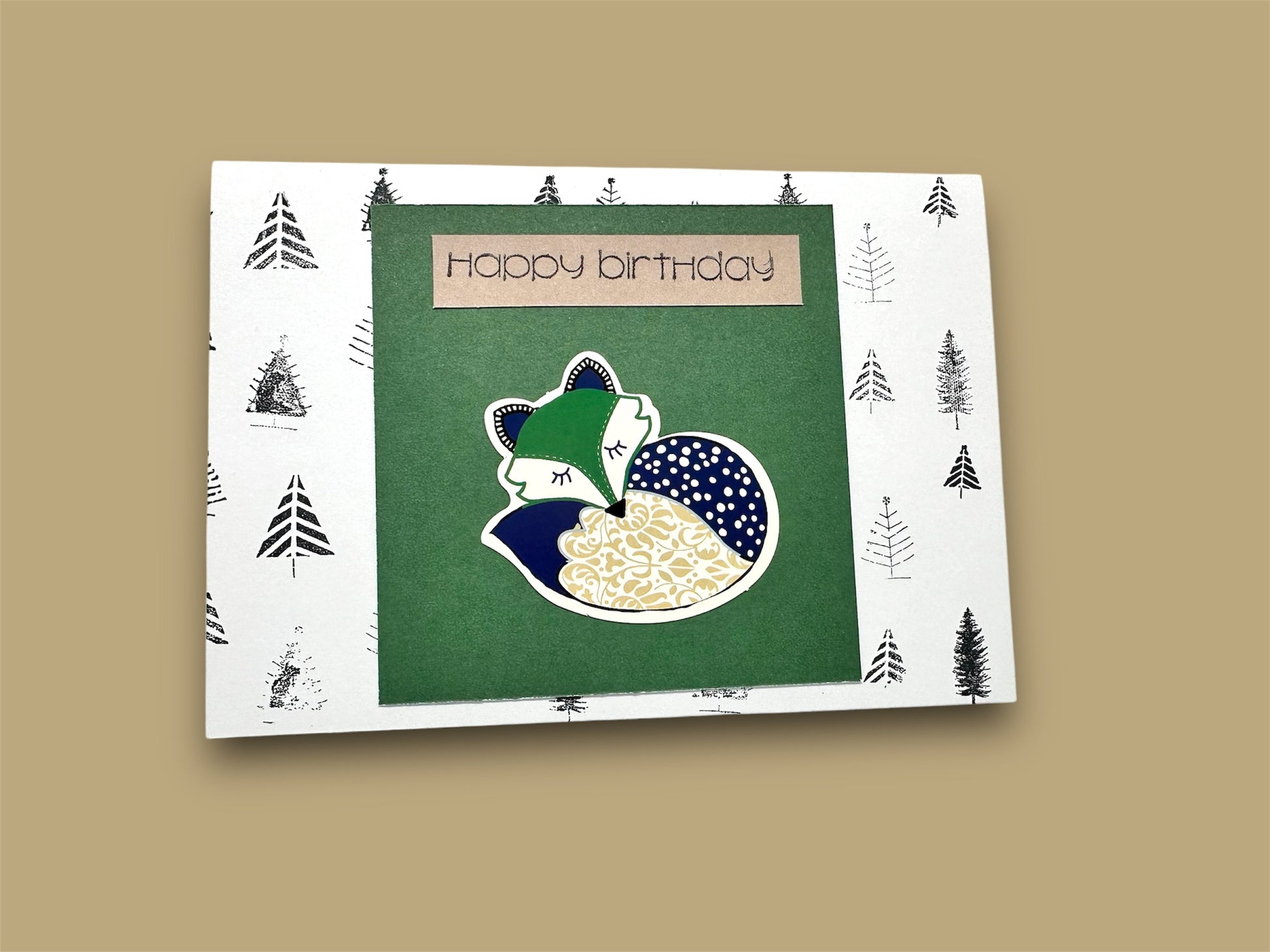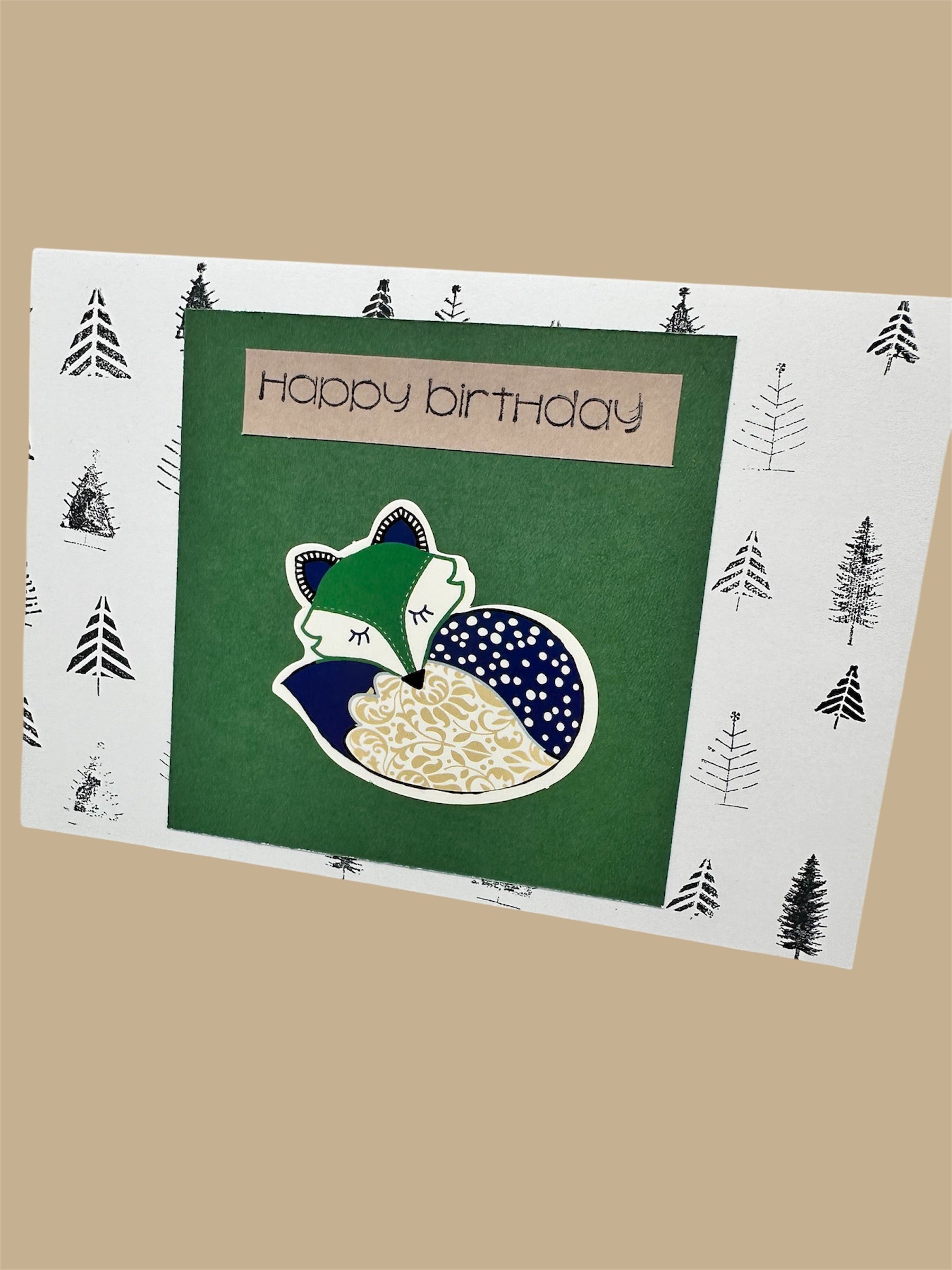 A delightful handmade birthday card, featuring a cute fox sleeping.