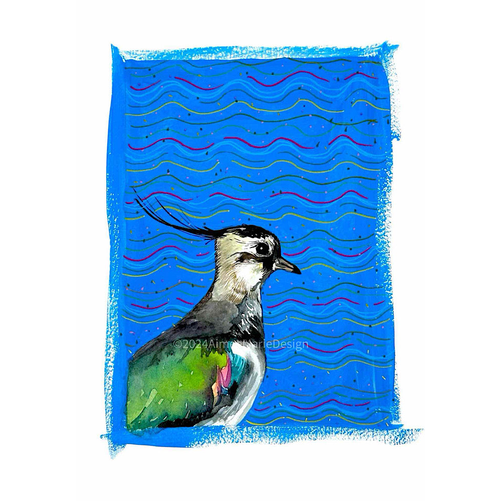 This Lapwing original art painting features a delicate wading bird with vibrant blues in the background.