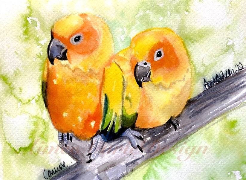 Expertly created with watercolour, this original painting showcases the vibrant and playful nature of conures.