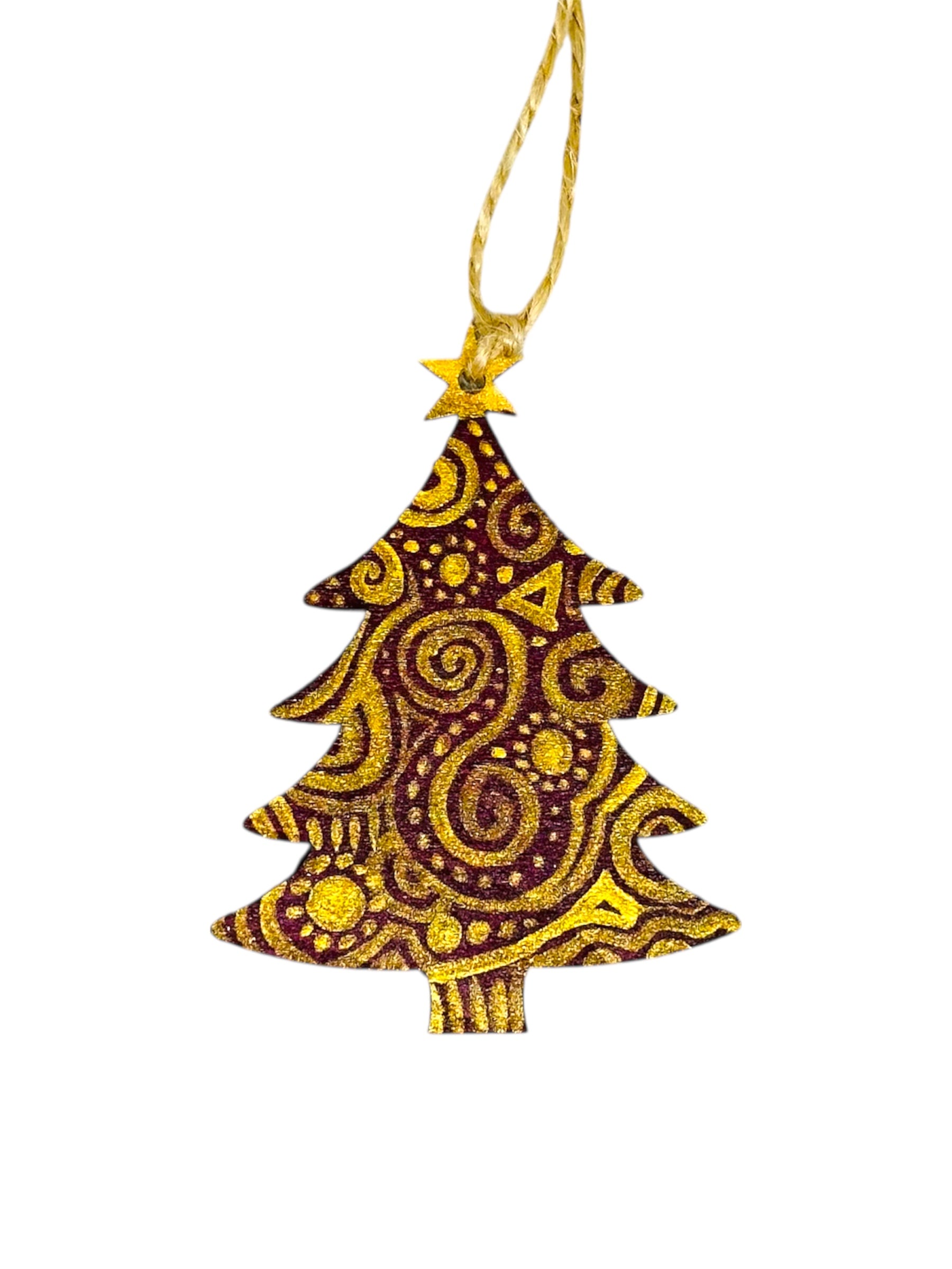 Hand painted with a rich red background and gold details, this wooden decoration is perfect for adding a touch of whimsy to your tree.