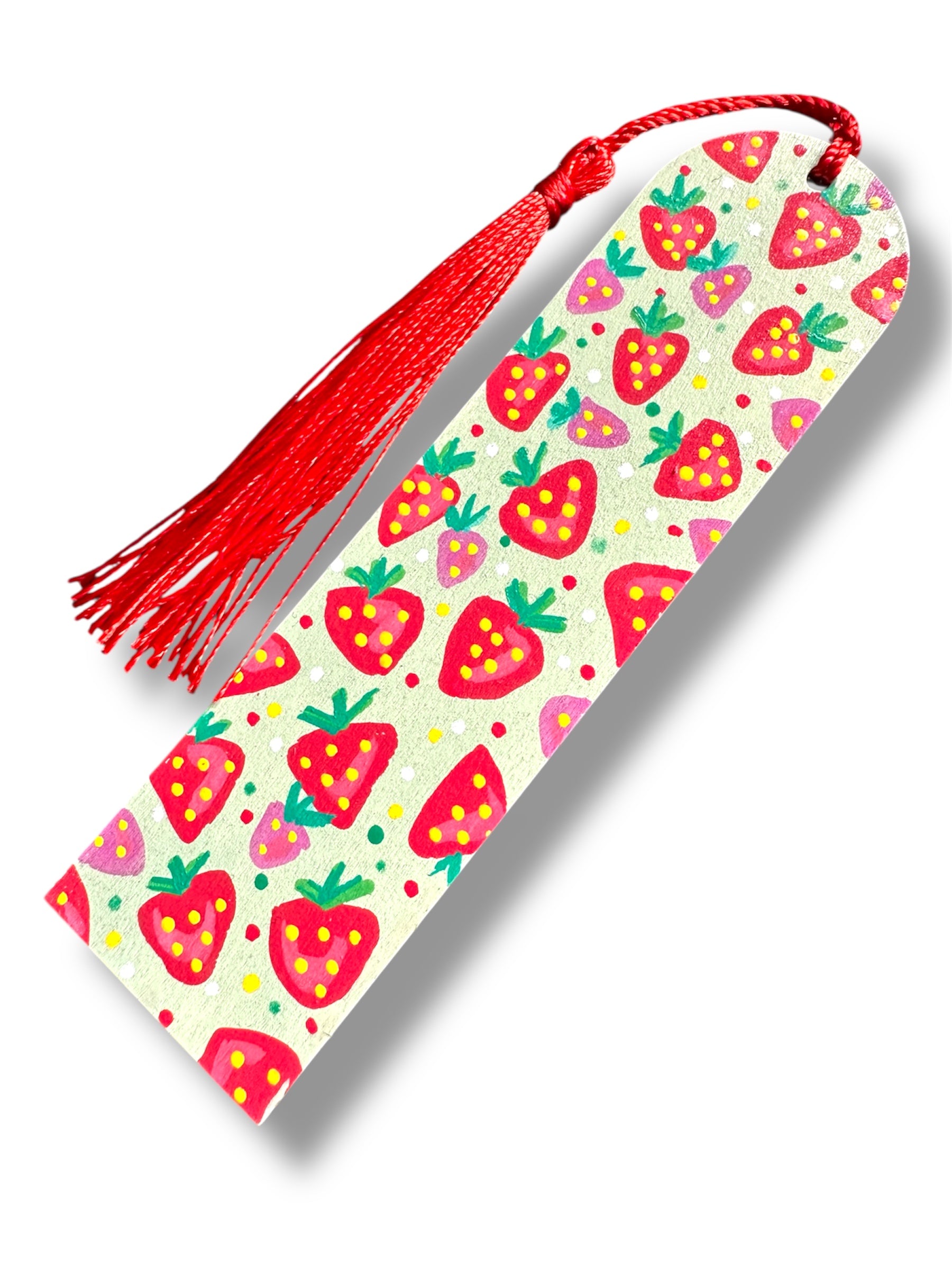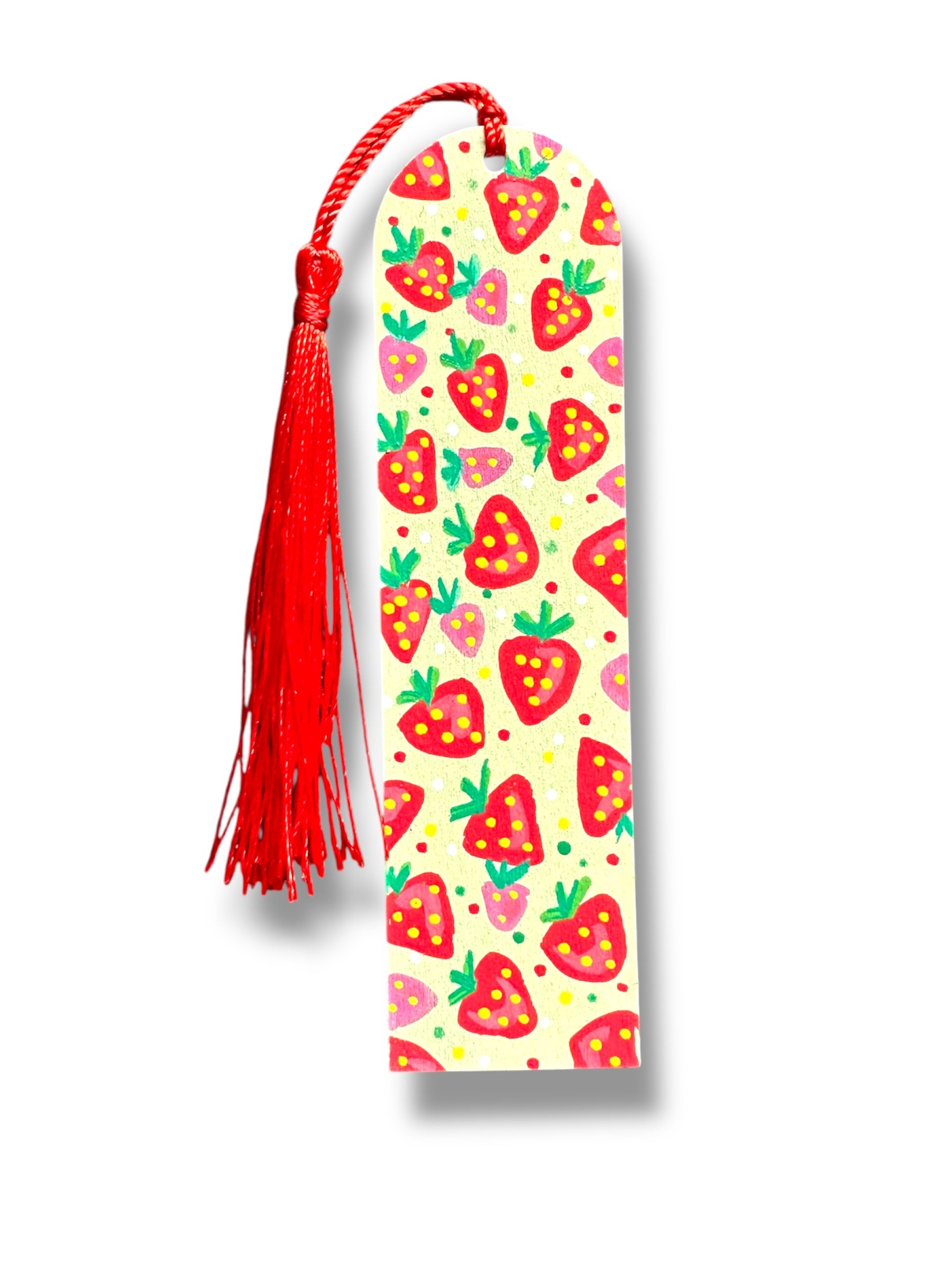 Expertly crafted wooden bookmark with vibrant, hand-painted strawberry illustrations in acrylic paint.