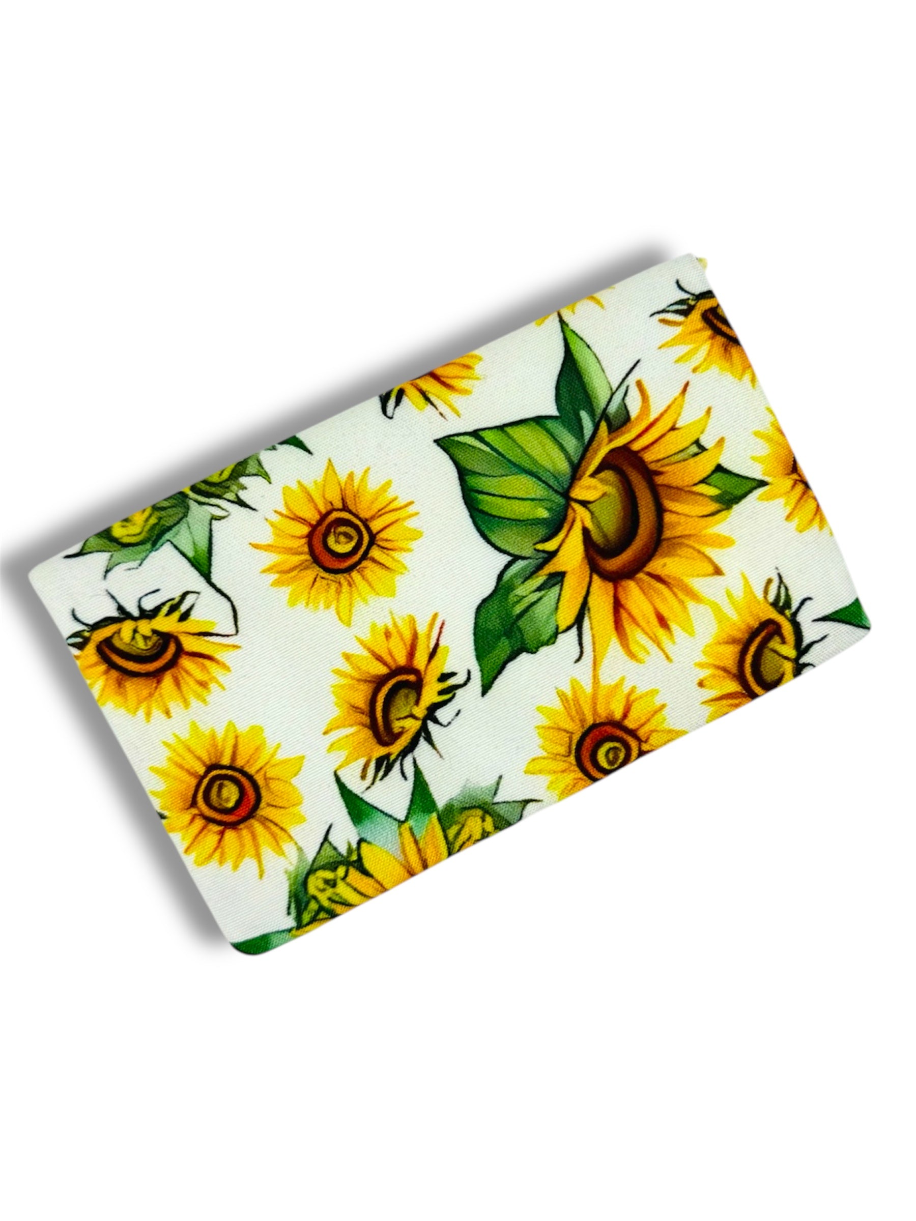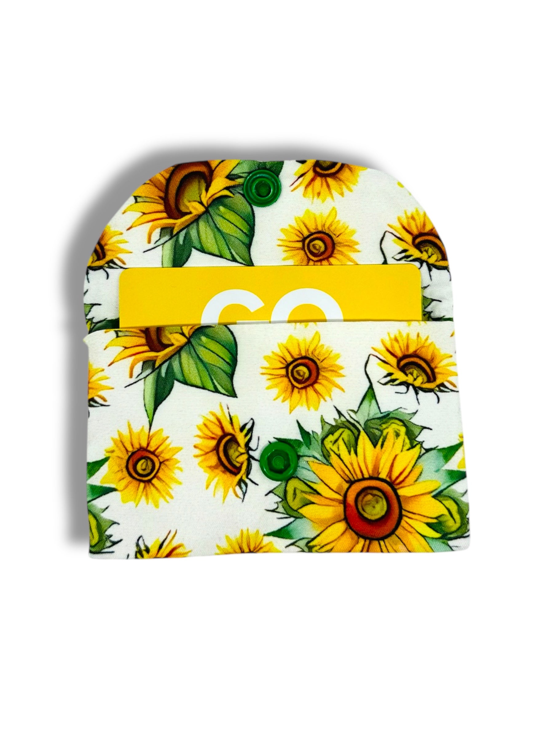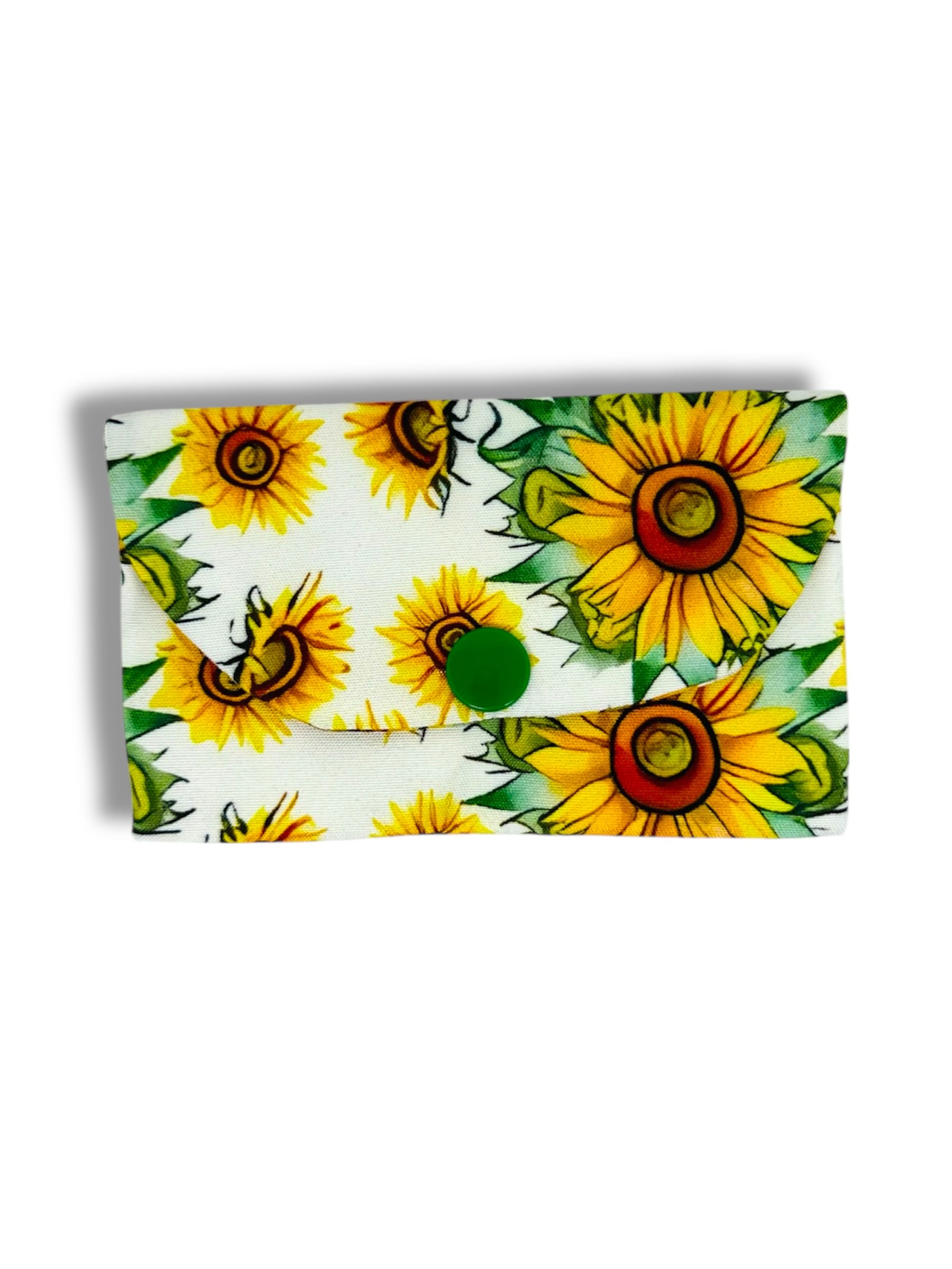 This handmade card wallet features a vibrant sunflower fabric and a secure green snap button fastening.