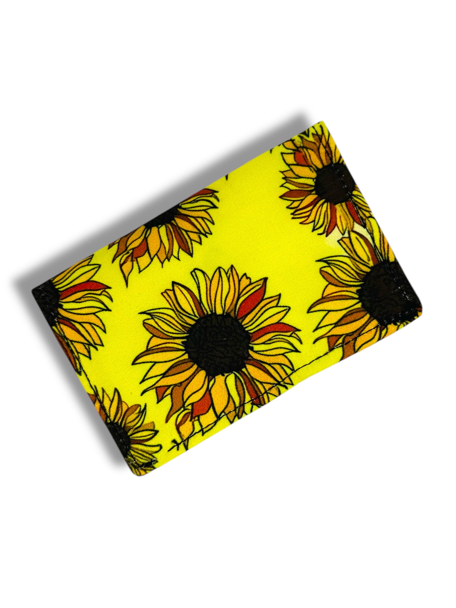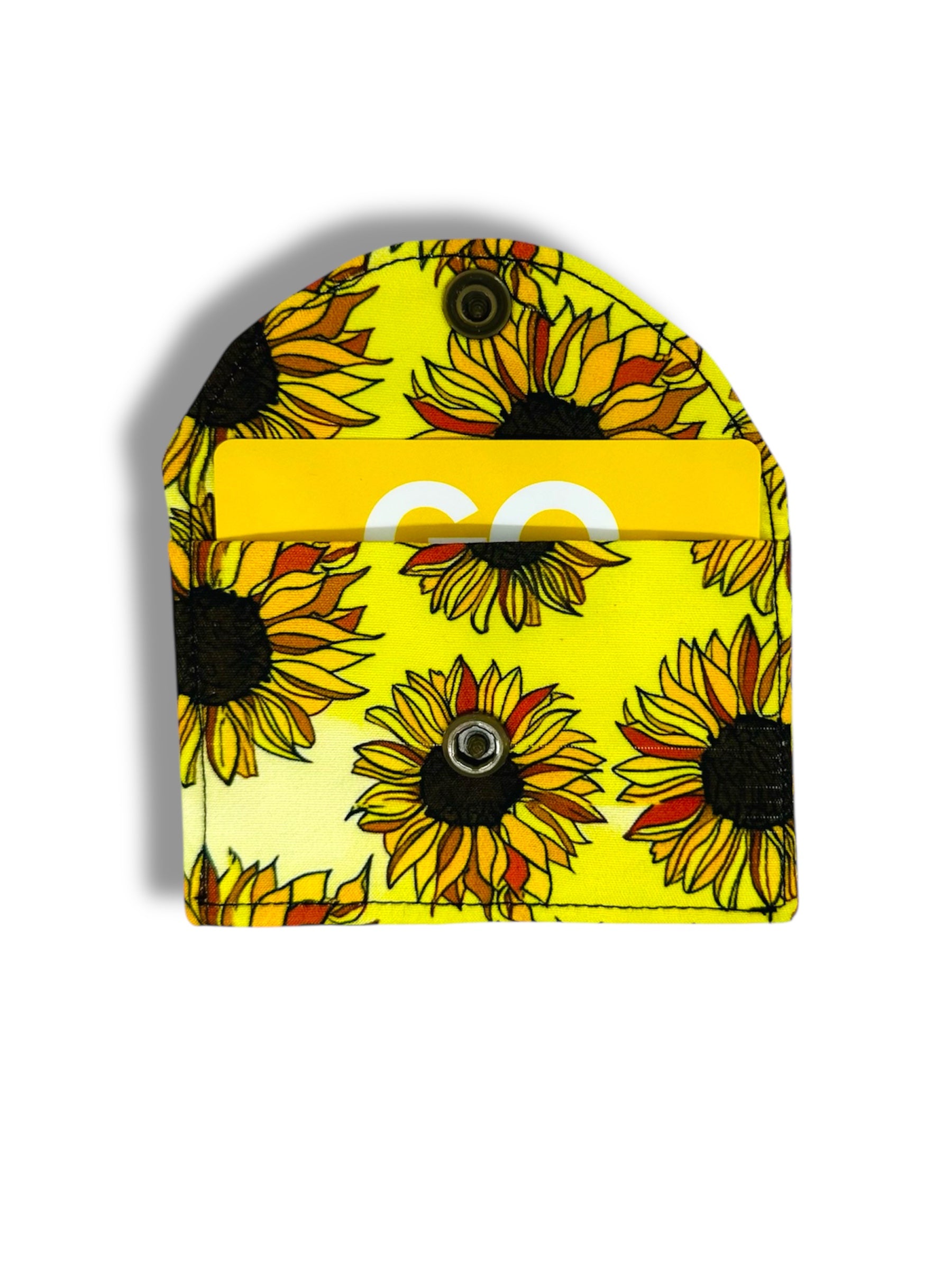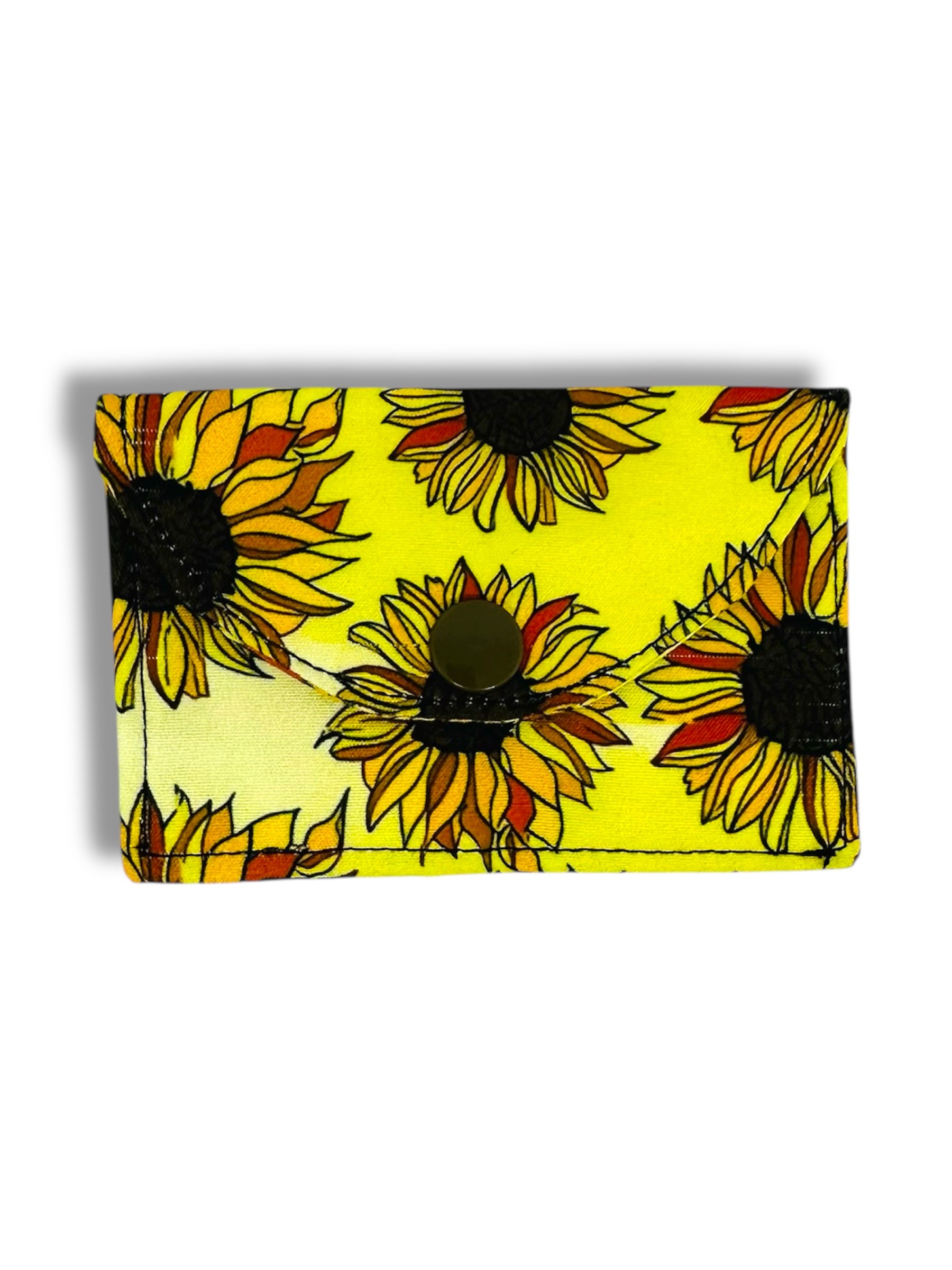 This handmade wallet features a beautiful sunflower fabric and a snap button fastening for added convenience.